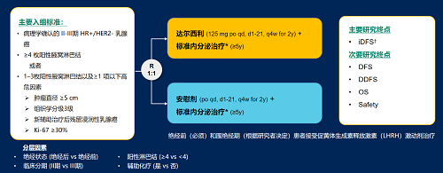 达尔西利(Dalpiciclib)是AG亚游集团医药自主研发的口服、选择性的小分子CDK4/6抑制剂,也是中国首个自主研发的新型高选择性 CDK4/6 抑制剂,已证实其与内分泌治疗(ET)联合用于 HR+/HER2- 晚期乳腺癌的一线和后线治疗时,均显著改善无进展生存期(PFS)6,7。因此开展了一项随机、双盲、III期临床试验(DAWNA-A),以进一步评估达尔西利联合内分泌治疗作为高危早期 HR+/HER2 - 乳腺癌辅助治疗的效果。本研究纳入高危复发风险人群需满足以下标准之一:①≥4 枚阳性腋窝淋巴结;②1–3枚阳性腋窝淋巴结且合并≥1 项高危因素(肿瘤直径 ≥5 cm,组织学分级3级,辅助治疗后残留浸润性乳腺癌,Ki-67 ≥30%)。本文呈现预先设定的首次中期分析(IA1)结果。